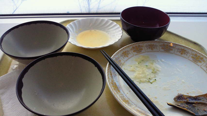 朝食の席にお茶碗二杯。
